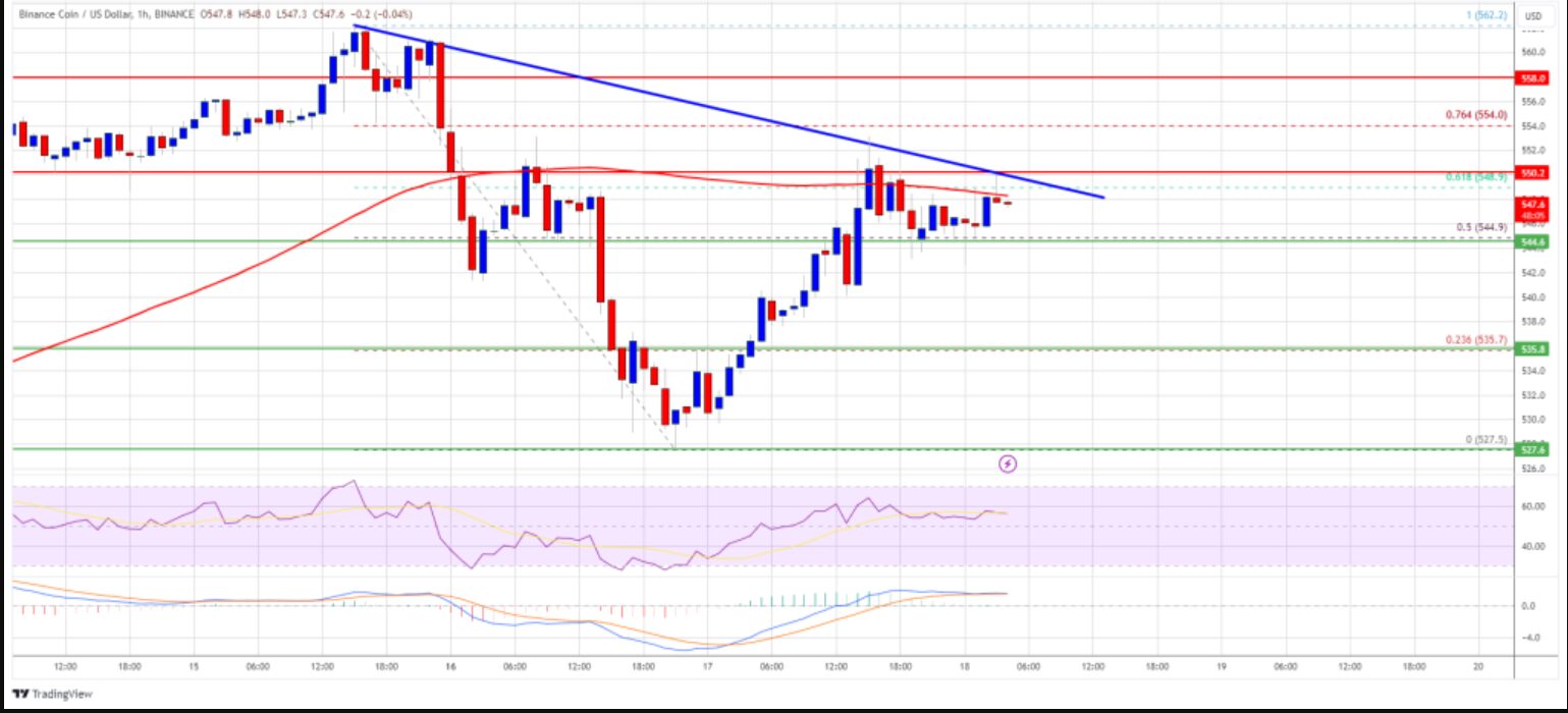 BNB has been trading above the $525 level and has recently experienced an upward trend that broke through the $535 resistance level. However, bears are still pushing the price closer to the $550 resistance level while the price remains below the 100-hour SMA. The technical analysis indicates that the price may be under pressure at the $550 level due to a bearish trend line.