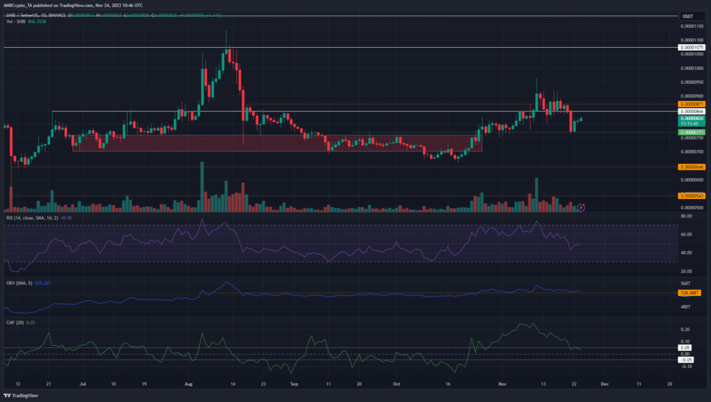 En el último mes, el rendimiento de SHIB ha sido relativamente moderado en comparación con Dogecoin (DOGE), y el interés en el ecosistema Shibarium pareció disminuir. El gráfico de un día reveló una estructura bajista cuando se rompió el reciente mínimo más alto de 0,0000078 $ el 9 de noviembre, lo que provocó que SHIB cayera a 0,0000076 $.