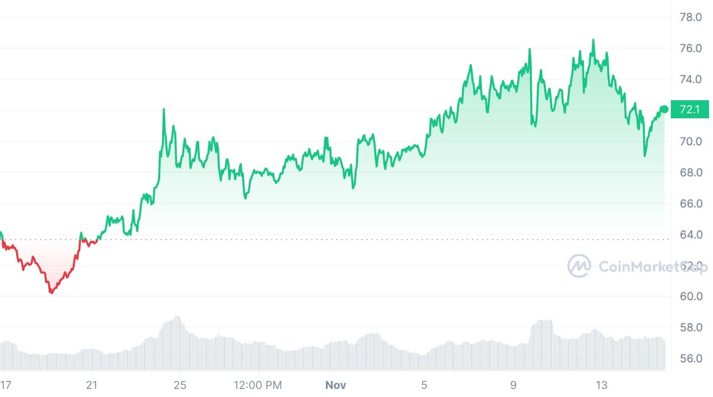 Litecoin cotiza a 72,1 dólares al cierre de esta edición y se está recuperando de una repentina caída registrada hoy, cuando llegó a los 68,8 dólares. En la última semana, ha perdido alrededor de un 2,2%, aunque también ha establecido un nuevo récord de tres meses en ese tiempo a 73,8 dólares. La última vez que cotizó por encima de ese nivel fue a principios de agosto, cuando el bombo de la reducción a la mitad estaba en su punto álgido.