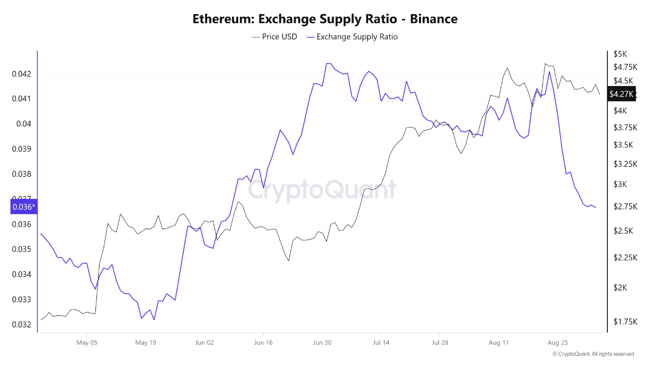 The latest data from analyst Arab Chain on CryptoQuant shows that Ethereum’s Exchange Supply Ratio (ESR) on Binance—the exchange with the largest ETH reserves in the world—has seen a sharp drop from 0.041 to below 0.037 in just the past two weeks. Interestingly, this drop occurred while the ETH price remained stable around its local highs.