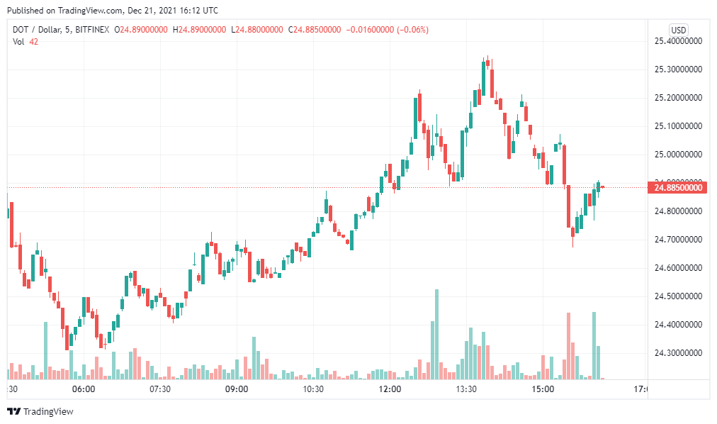 DOT is trading at $25.40, having gained 7.3 percent in the past day. Despite the gain, it remains just outside the top ten after massive gains by Terra (LUNA) and Avalanche (AVAX) in the past week.