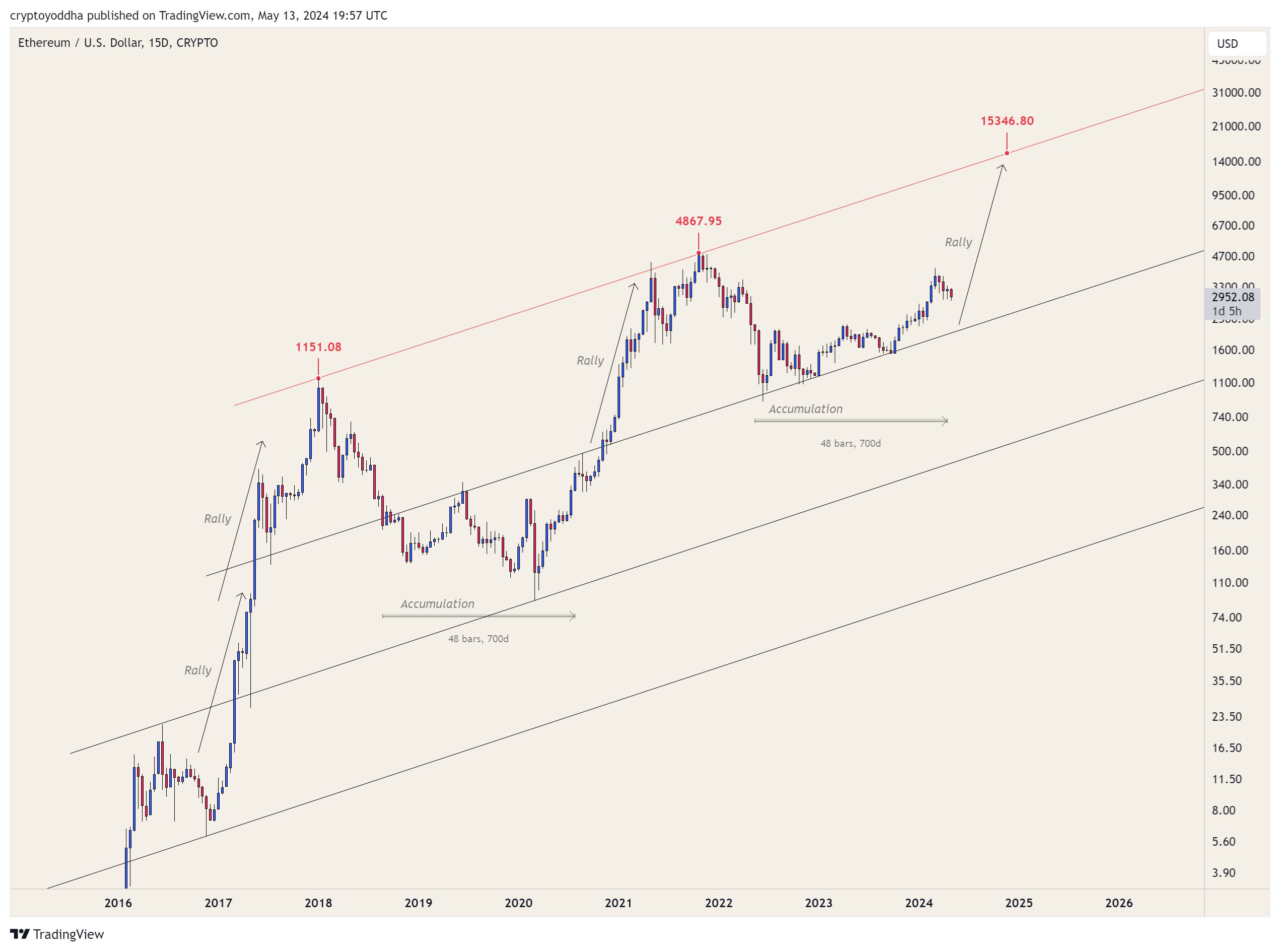 Setelah keluar dari pola ini, Ethereum dapat melonjak ke level tertinggi US$15.000, sejajar dengan garis tren atas dari pola harga dari siklus sebelumnya.
