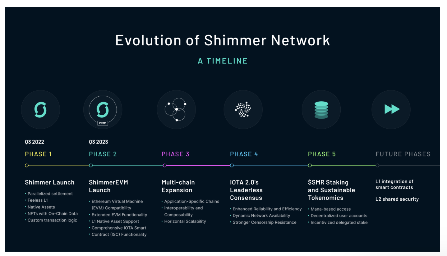 Путешествие Shimmer началось в третьем квартале 2022 года с внедрения нативных активов в параллельную бухгалтерскую книгу IOTA, известную своими параллельными расчетами, бесчувственными транзакциями и расширенными возможностями NFT. За этим последовал выпуск ShimmerEVM в 3 квартале 2023 года, в котором была реализована совместимость с виртуальной машиной Ethereum (EVM) и расширены функциональные возможности для поддержки динамично развивающейся экосистемы Web3.