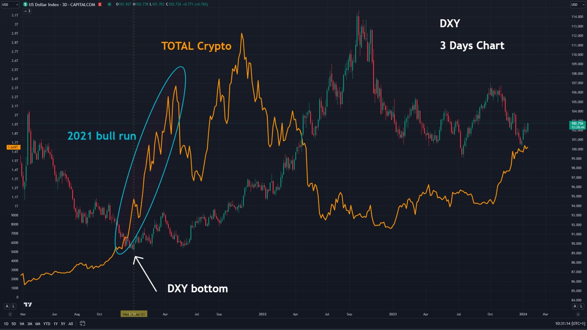 Взаимосвязь между курсом доллара США и ценой биткоина и других рисковых активов хорошо задокументирована. В последние годы в 2021 году доллар США потерпел сильнейшее поражение по отношению к другим валютам. Как показывает один из аналитиков, когда DXY достиг дна, цена BTC начала расти и достигла своего исторического максимума в том же году. Некоторые криптовалюты, такие как BNB, достигли своего ATH в течение нескольких месяцев после того, как DXY достиг дна.